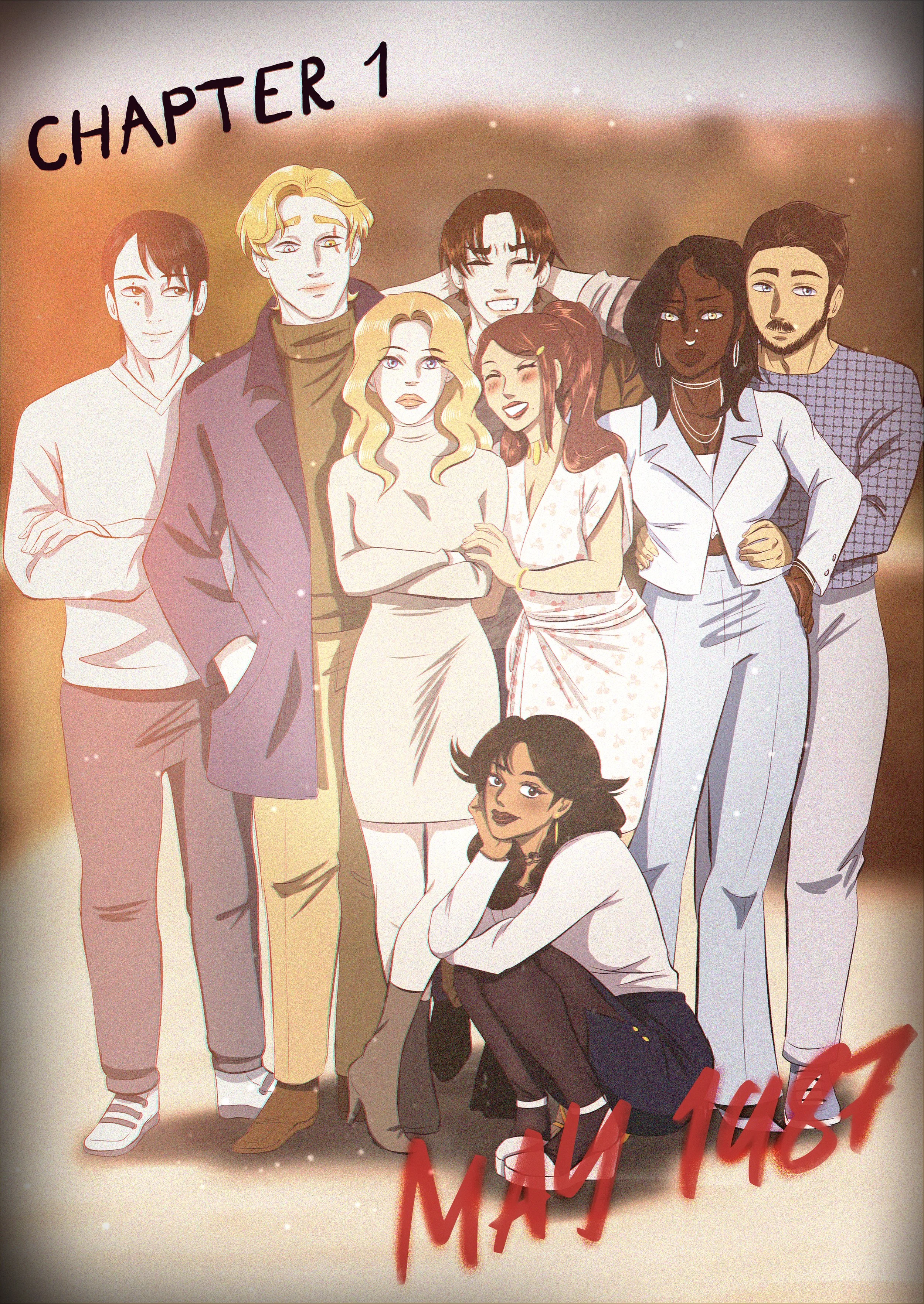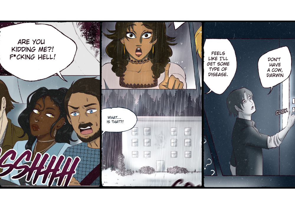 Don’t Come In has a limited color palette that shifts depending on the setting and mood of the scenes. From what we can see in Chapter 1, when the group is outside, you can see their assigned colors but its tinted in this contrast that makes the reality Before Shit Goes Down (TM), all the more jarring especially when their colors get leeched and becomes cooler and darker once inside the mysterious building.